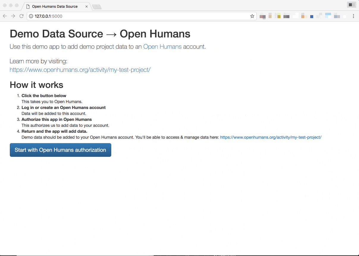 This template is a Django/Celery app that enables the end user - an Open Humans member - to add dummy data to an Open Humans project. The user arrives on the app's landing page (index.html), and clicks a button which takes them to Open Humans where they can log in (and create an account if necessary). Once logged in to the Open Humans site, the user clicks another button to authorize this app to add data to their Open Humans account, they are then returned to this app (to complete.html) which notifies them that their data has been added and provides a link to the project summary page in Open Humans.
