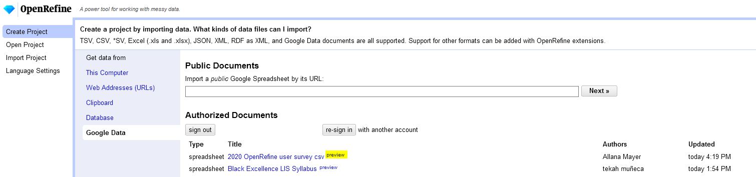 In Create Project, the tiny "preview" that appears after each Google Sheet available for import from my Google Drive account:
