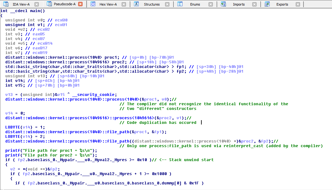 We see that in the list of compiled distant library functions, no distant::process constructor is compiled, effectively combining both previous distant::process constructors (1024 and 1024614) into a single call to the base constructor: