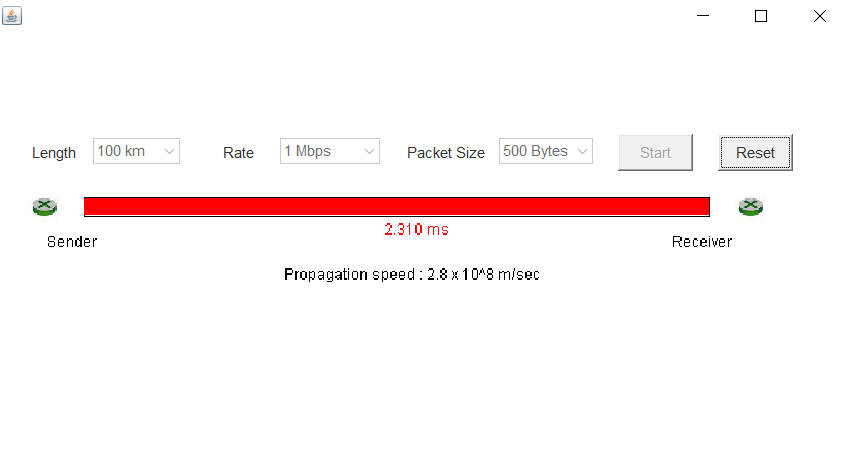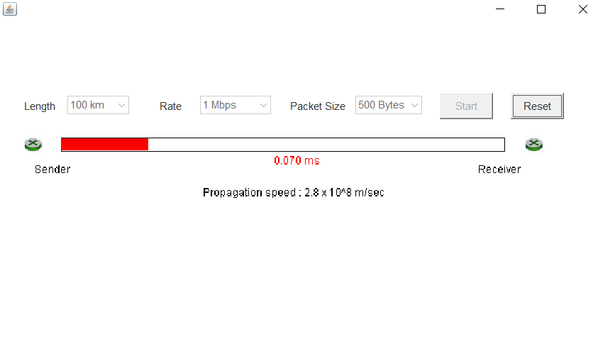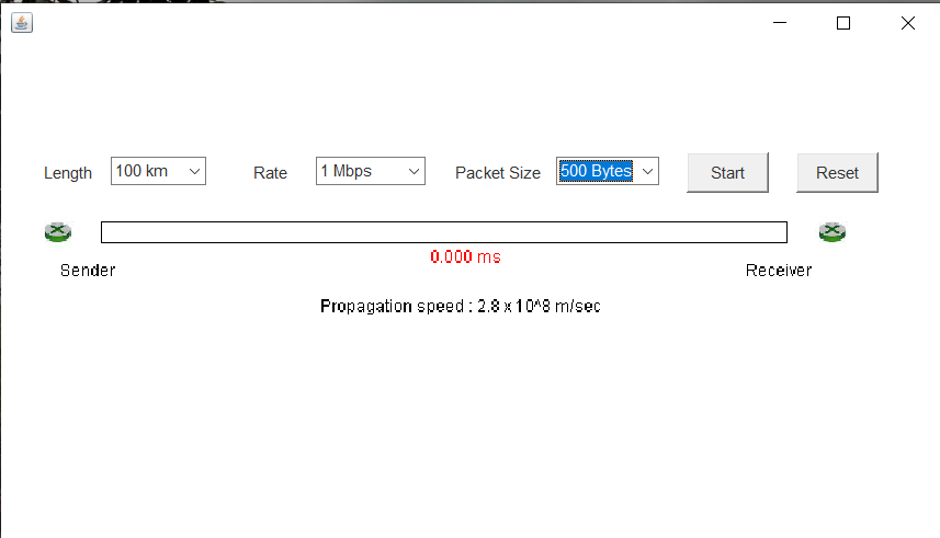 As a part of implementation, we need to set up a web page for a GUI to simulate transmission delay versus propagation delay. The web page must show the first figure on the previous page to set the length between sender and receiver, transmission rate, and packet size and start simulation as well as to reset the simulation.