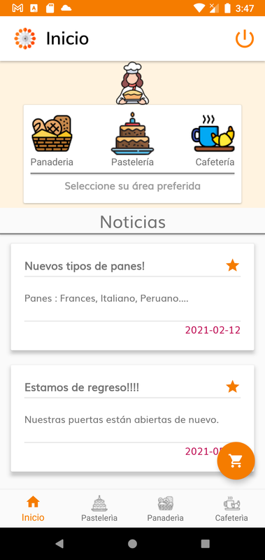 Bueno en esta ocasión mostraremos los 4 segmentos ( Inicio , Pastelería (El cual es el enfoque del proyecto), Panadería, Cafetería) que contiene la app, ya que este proyecto fue realizado para un proyecto universitario