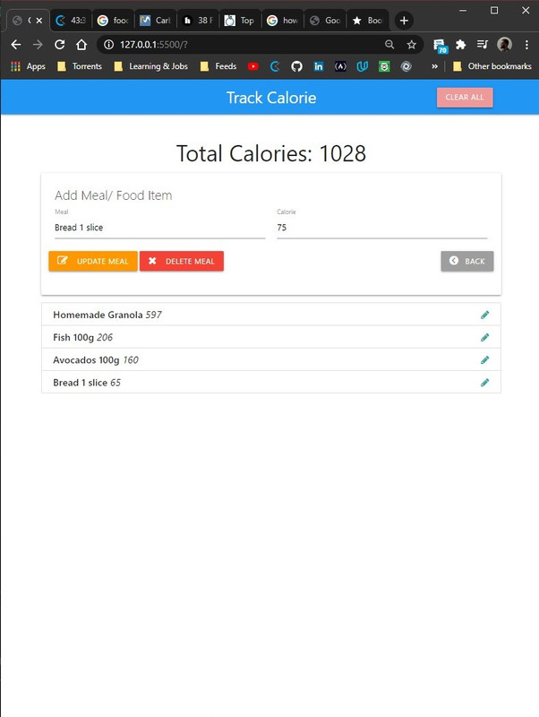 This is calorie tracker application that I have created which uses all the concepts of Vanilla JS and Module patterns and IFFIES. This app is fully functional with add update delete meal item. I make use of local storage for making the data persistent. For styling I used Bootstarp CSS
