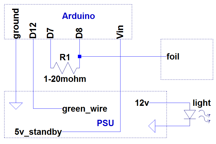A touch or near presence based light switch using low cost parts. Designed to work with an ATX power supply, but MOSFET adaptation should not be too difficult and would be more efficient likely.