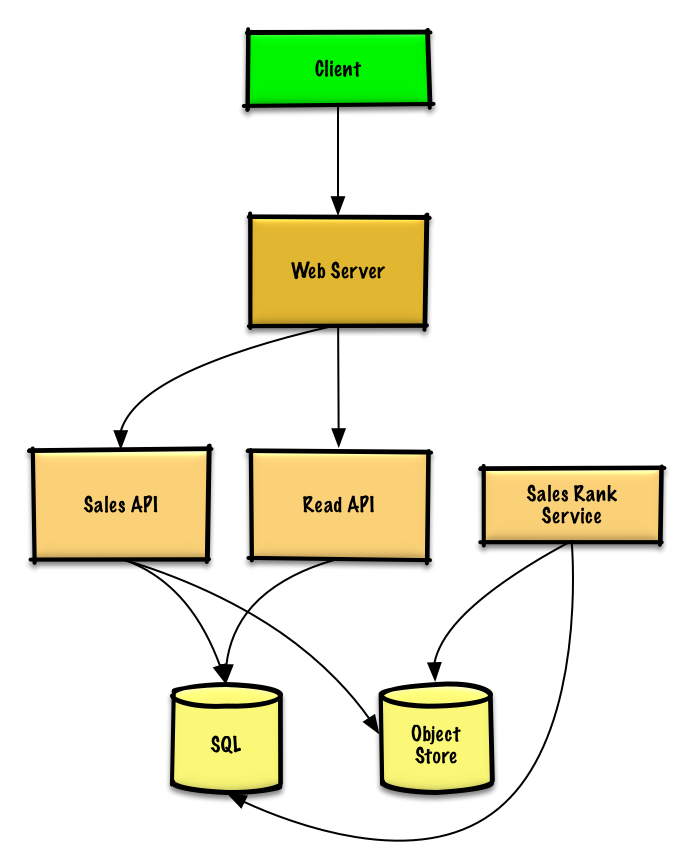 The Sales Rank Service could use MapReduce, using the Sales API server log files as input and writing the results to an aggregate table sales_rank in a SQL Database. We should discuss the use cases and tradeoffs between choosing SQL or NoSQL.