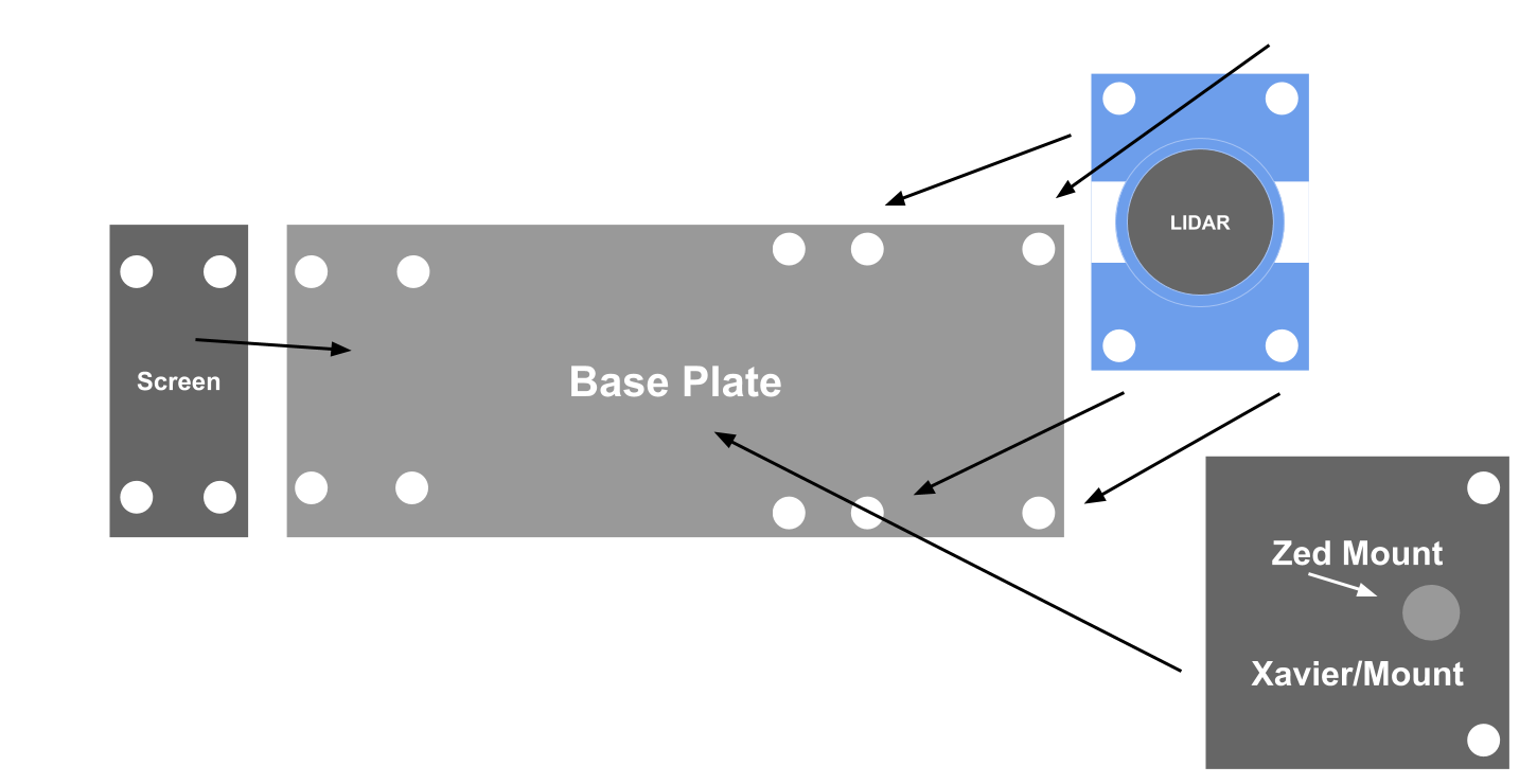 Above is the rendering of how the rover will look when it's finished. The process is straight forward, you first place the second plate above the main plate using x1 long stilt and x1 medium stilt but make sure you have your battery velcro in pace first. Then once you place the plate uptop you can mount the 3d printed parts. The lidar goes to the front of the chassis and its front holes line up with the front holes on the top plate. Then directly behind the lidar mount you mount the Xavier print (make sure the Xavier is already in the mount) and the Zed camera mount in the hole created for it (use a drill to put a screw in the small hole to hold the pole.).