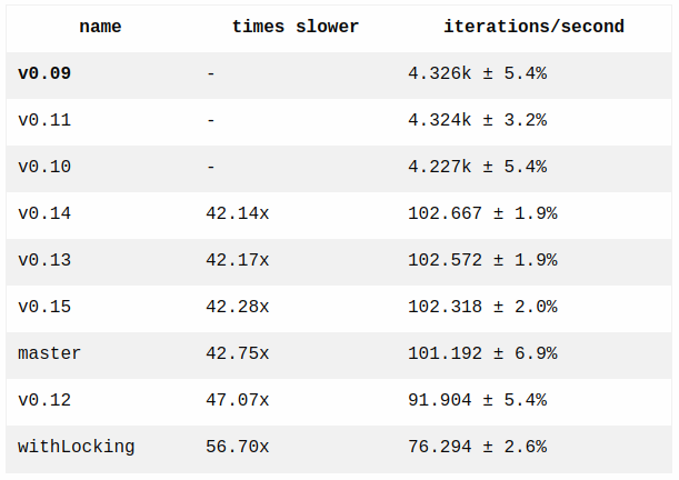 As you can see the last version where reading events is efficient is 0.11. In 0.12 reading from stream became 42x slower.