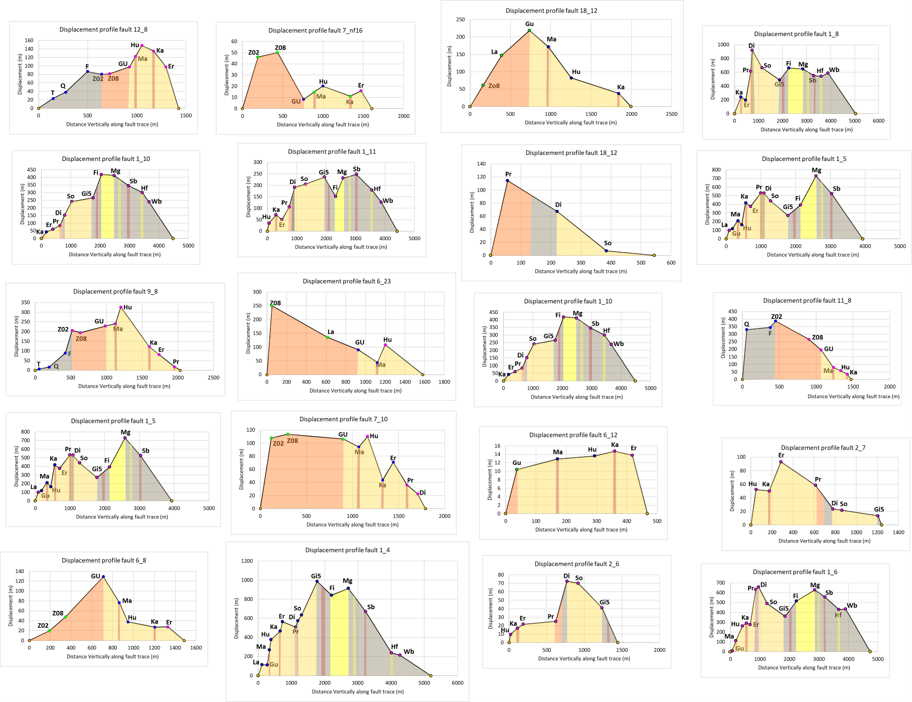 We analyse relationships between displacement and distance along thrust faults that cut multi-layered sandstones, siltstones, rhyolite tuff, claystone and coals using a mine dataset in the Ruhr coalfields. These coalmines dataset provides a detailed interpretation of thrusts faults recorded in subsurface cross-sections that allow investigating relationships between displacement and distance along thrust faults that cut multi-layered stratigraphies. The fault displacement of the interpreted coalbed horizons and of the thrusts faults on the cross-sections is measured in the vicinity of each fault plane vertically with an uncertainty close to 10 m, and we assume that displacement to be zero at fault tips (Fig. 3). Distance data include the vertical distance along the faults planes between coalbed horizons and the upper fault tips as reference points within the surrounding lithologies units (Fig. 3). In the cross-sections, the coalbeds horizons are the lithological interfaces between sedimentary formations as well as internal coalbed seams within these sedimentary units where the faults are reversed thrust faults. We established 98 displacement profiles by cross-plotting the displacement data against the distance data (Fig. 7 and Appendix - Table 2). We also calculated the vertical throw and heave between horizons cut-offs and reference points on the faults planes, as well as the dips and azimuths of the faults and their adjacent bedding planes (Appendix - Table 1). All faults show reverse displacement and are often associated with folding, with a maximum value of 1.15 km to 2.1 m and a throw of 387 m to 0.3 m, while the mean of displacement is 209 m and the throw 65 m (Table 1). The heave of the interpreted thrusts ranges from 0.5 m to 978 m, with a mean heave of 186 m (Table 1). Additionally, we use the uncertainty nomenclature after Drozdzewski et al. (1980) to reflect the uncertainty classes as an envelope on the displacement distance profiles. Drozdzewski et al. (1980) define the uncertainty nomenclature as, first, “proven” that is, the direct observation on cross-sections. Second, “secure” is the interpretation within 100 m on cross-sections. Third, “assumed” is the interpretation beyond 100 m on cross-sections following.