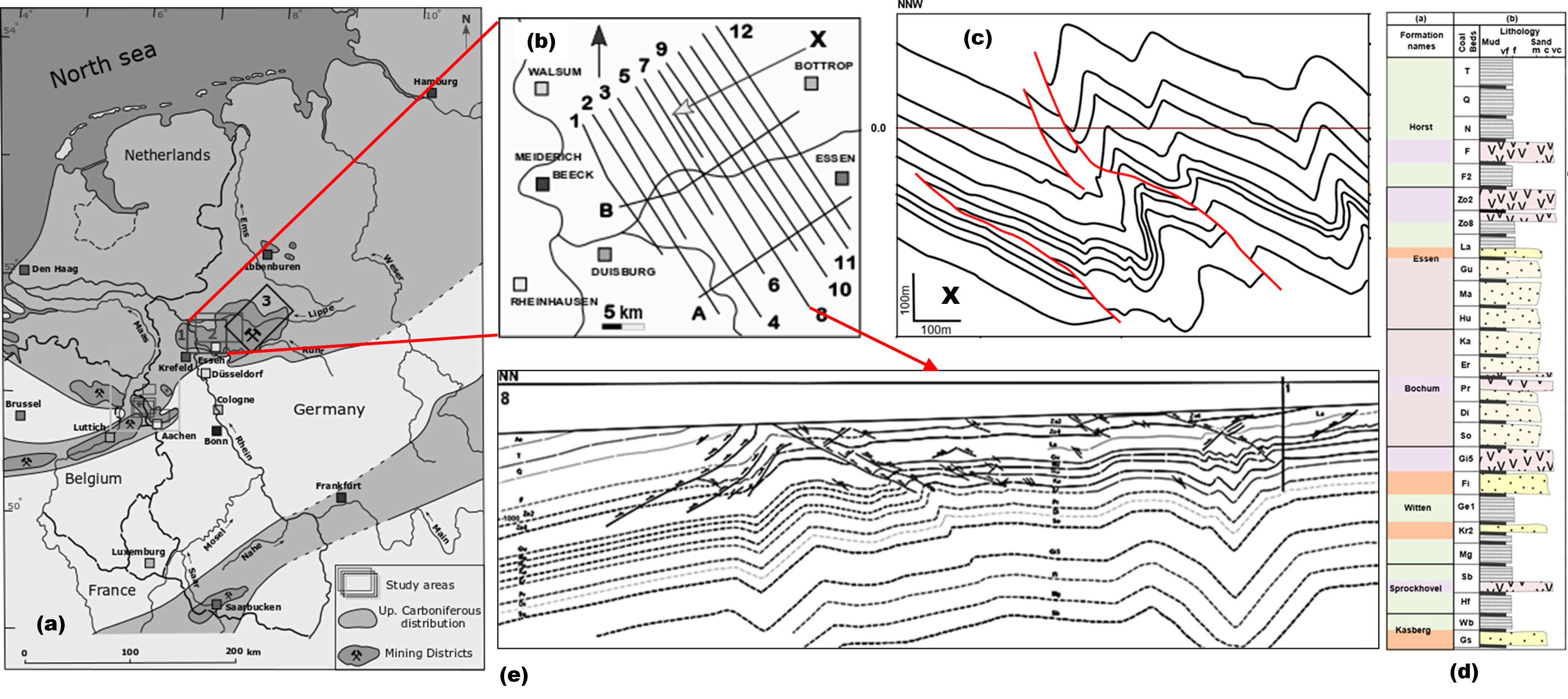 The crystalline basement rocks located in the Northwest of Germany can be divided by approximately NW-SE to SW-NE running graben and horst systems from the Hercynian and Rhenish geological mountain-building events (Brink 2021). The sea flooded these systems, and primarily marine carbonates were deposited on the horsts and Stillwater shales in the grabens during the Late Devonian and Early Carboniferous times (Brink 2021). The terrain became a coal-rich foreland basin throughout the Late Carboniferous Variscan Orogeny, where the grabens responded through thrusting and folding with different anticlinal patterns (Wrede 2005). These grabens were the location of the Late Carboniferous sub-basins, including the Ruhr coal-rich sub-basin in the western sector (Fig. 2 and 3) (Brink 2021). Therefore it probably acted as a perfect example to study thrust complex structures.