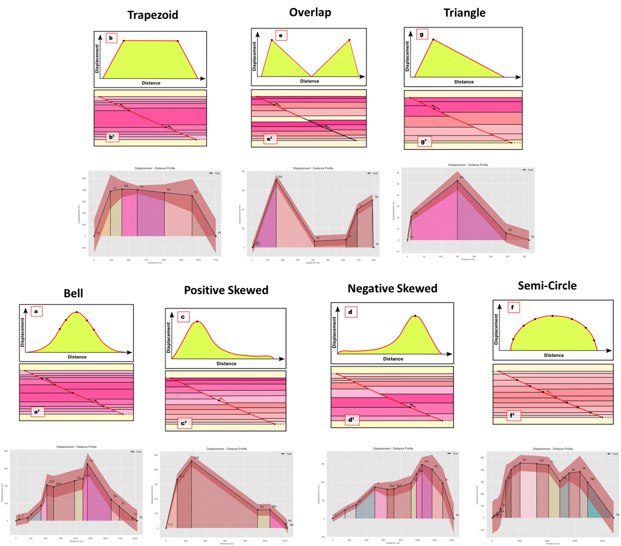 • Displacement profiles have complex profile shapes with a wide range of profile patterns controlled by the mechanical stratigraphy of the units.