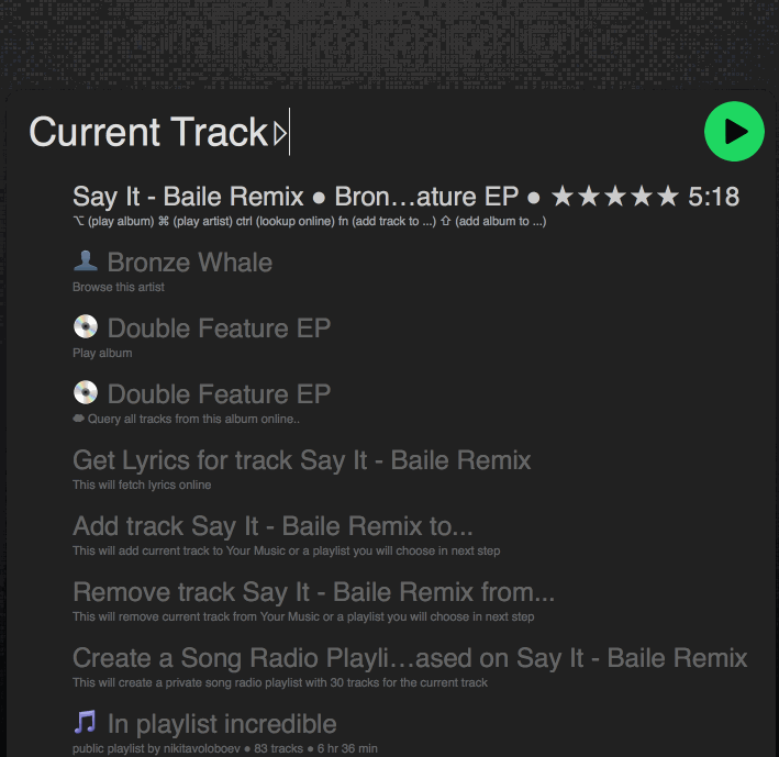 - Spotify Mini Player (mentioned it briefly above, but this is an absolutely phenomenal tool that allows me to essentially control through the entirety of Spotify client through a quick Alfred prompt) (very powerful workflow) ds