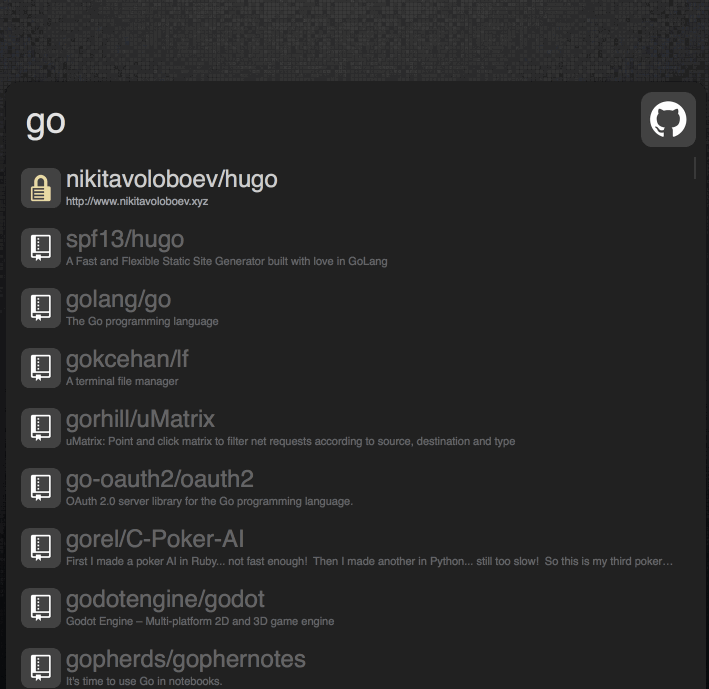 - Github Command Bar (allows me to quickly find any repository that I want, search through Github, go to my current issues, my dashboard and a lot lot more)