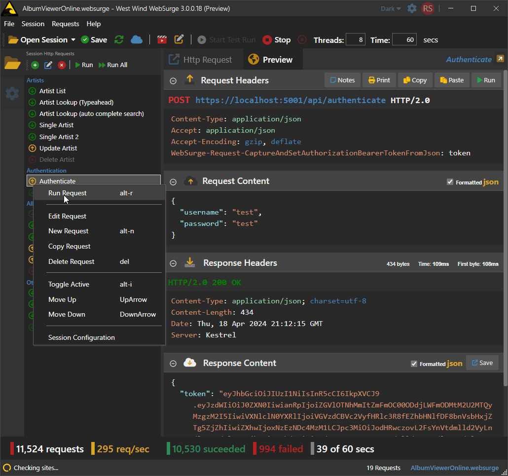 The goal of this tool is to make it drop dead easy to capture or create HTTP requests, quickly test them individually and then play them back easily under load. WebSurge provides simple results that are easy to understand and act on. It's quick and easy so that you can frequently stress test Web applications for load characteristics during development and in production.