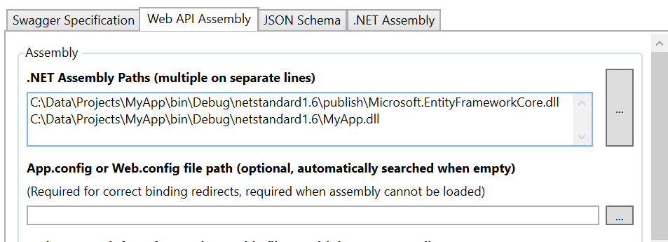 This is required to generate the OpenAPI specification outside of a running ASP.NET process, i.e. it can be generated externally (e.g. via command line). However, this process may be tricky - for example, because some required DLLs are missing or NSwag runs with newer versions of libraries than the loaded Web API or ASP.NET Core assembly. To avoid problems with this process, you should use the NSwag binary of the same runtime as the assembly to load.
