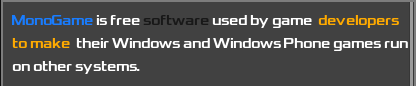 "{blue();}MonoGame is free {#(25,25,25);}software used by game {#(255,170,0):p;}