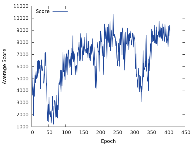 - The large spikes in score at around 120 epochs was likely due to a simulation bug by which the robot interacted with another object in such a way that a large force was created.