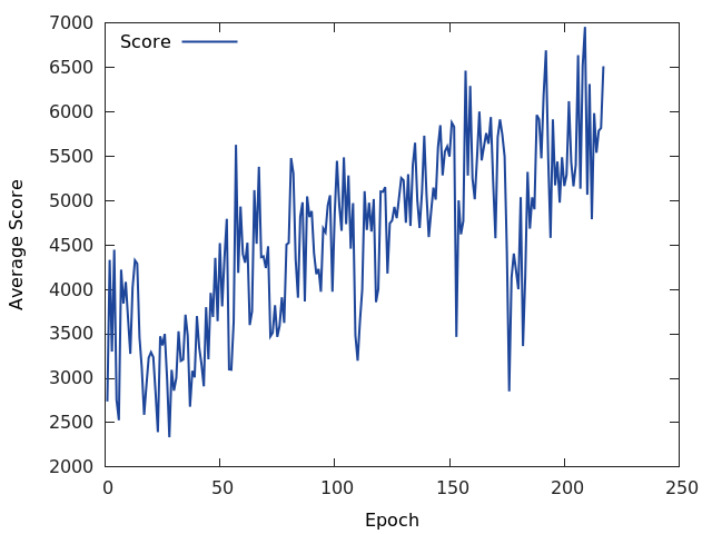 Unlike maximising speed in a walled environment this task can be more refinely completed so the score increase takes a more linear trend. The generality of the task results in frequent drops, but this does not explain the sustained drop in score from 170-190 epochs. I observed this phenomenon in another, earlier, experiment.