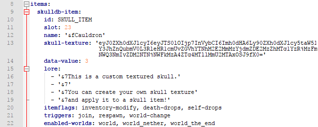 TranslatableDisplayNamewith the String value&aUltra &cItemand addSlotwith the Integer value 33`. - This is mainly useful for implementing features from other plugins.