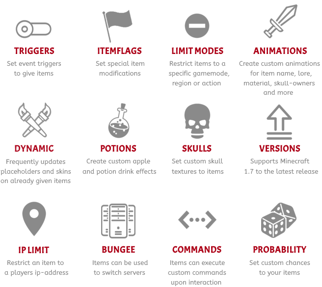- ItemCommands can be executed with certain actions if defined, multi-click, left/right-click, physical, and/or inventory click, which will allow the user to define different commands for each action.