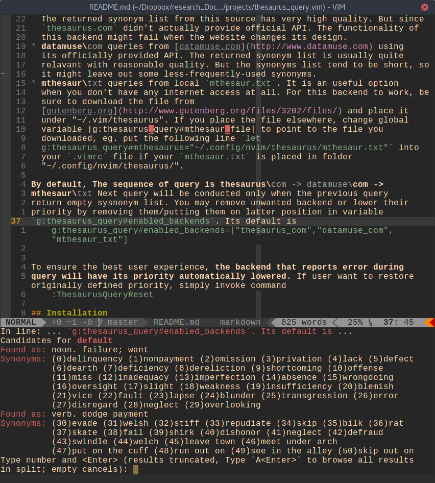 th_en_US_v2.idxand database fileth_en_US_v2.datin/usr/share/myspell/dicts, and this plugin should work outright. But if not, you can download the thesaurus data from this link. You may then manually inform the plugin of the downloaded location on your machine by setting variableg:tq_openoffice_en_file. Eg, if your indes and database (2 files) are~/Downloads/MyThes-1.0/th_en_US_new[.idx,.dat]then you should set your variable by addinglet g:tq_openoffice_en_file="~/Downloads/MyThes-1.0/th_en_US_new"in your.vimrc. - mthesaur_txt queries from local