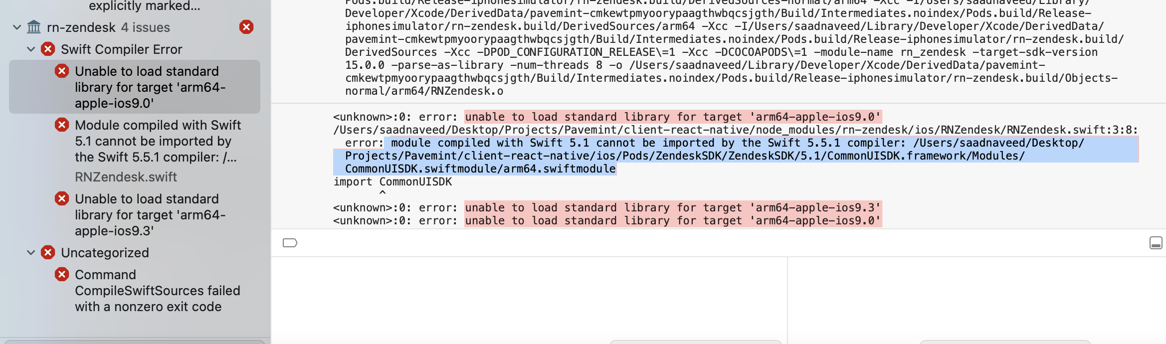 module compiled with Swift 5.1 cannot be imported by the Swift 5.5.1 compiler: /Users/saadnaveed/Desktop/Projects/{my-project-name}/client-react-native/ios/Pods/ZendeskSDK/ZendeskSDK/5.1/CommonUISDK.framework/Modules/CommonUISDK.swiftmodule/arm64.swiftmodule