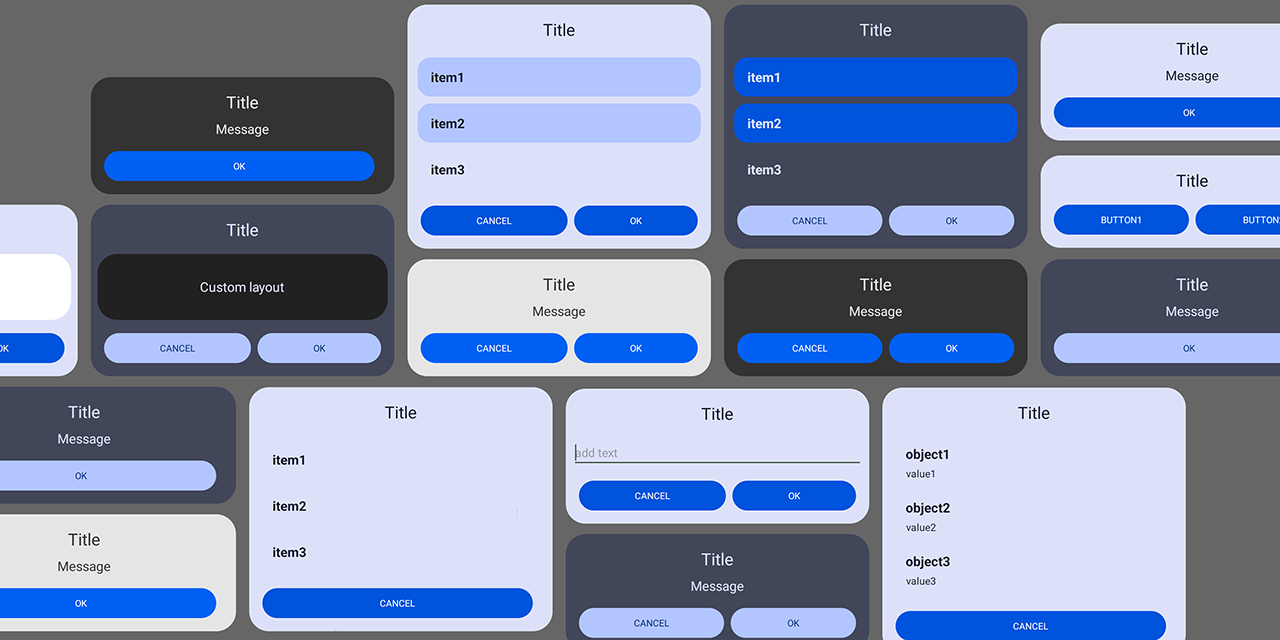 Android library for creating custom dialogs. You can change color and background resouce of a buttons and dialog background and color of a text. Supports Material3 theme colors. It has several types of dialogs: