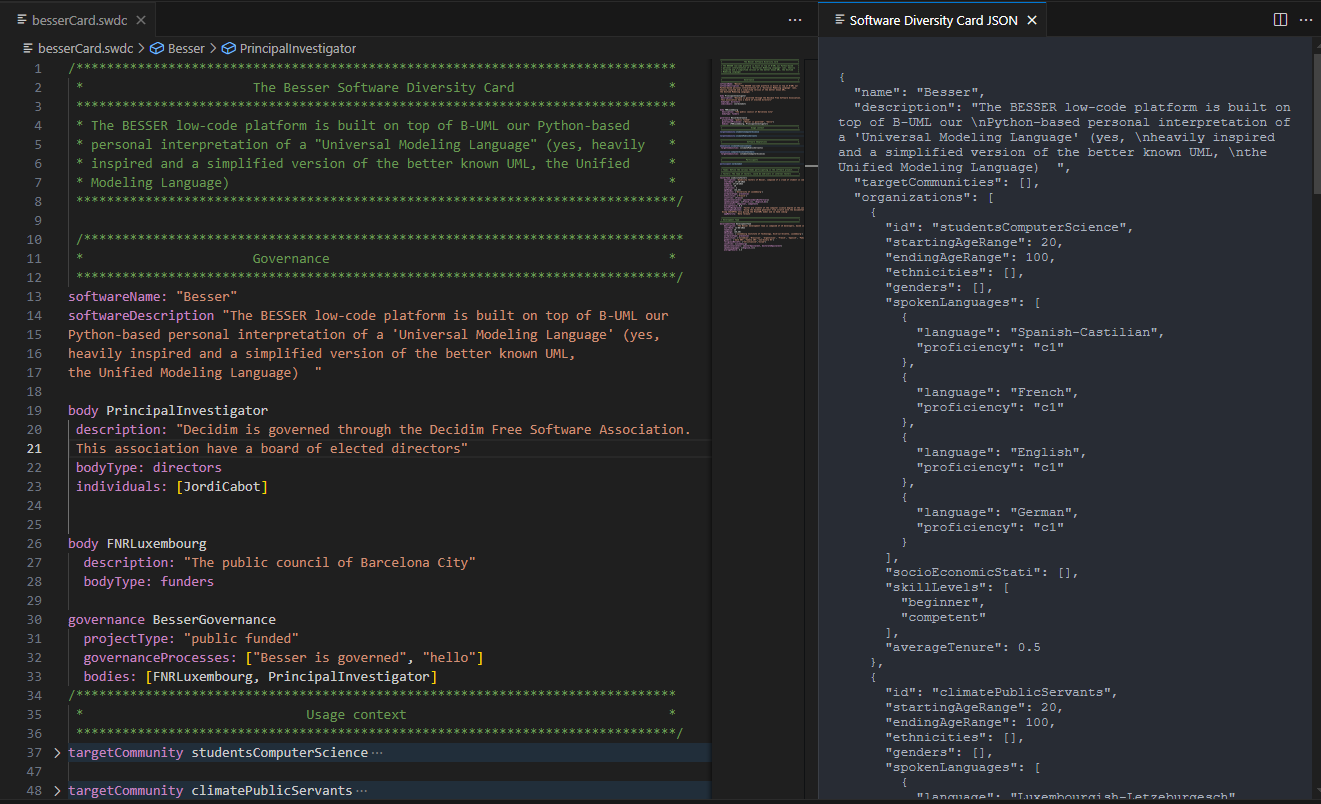 In the examples folders, you can find two examples of Software Diversity Card instances described using the plugin of two mature open-source projects involving different groups of people. The two projects are Decidim, a participatory software used by over 400 administrations worldwide to allow citizens to participate in public decisions, and Besser, a low-code platform designed to enable non-coding profiles to develop software applications in various domains. Despite their distinct characteristics, such as target users, both projects are open-source, publicly funded, and part of a user community.