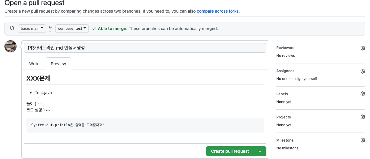 오른쪽에 Reviewers의 톱니바퀴 버튼을 눌러서 스터디원 전원을 리뷰어에 추가하고 PR을 생성한다.