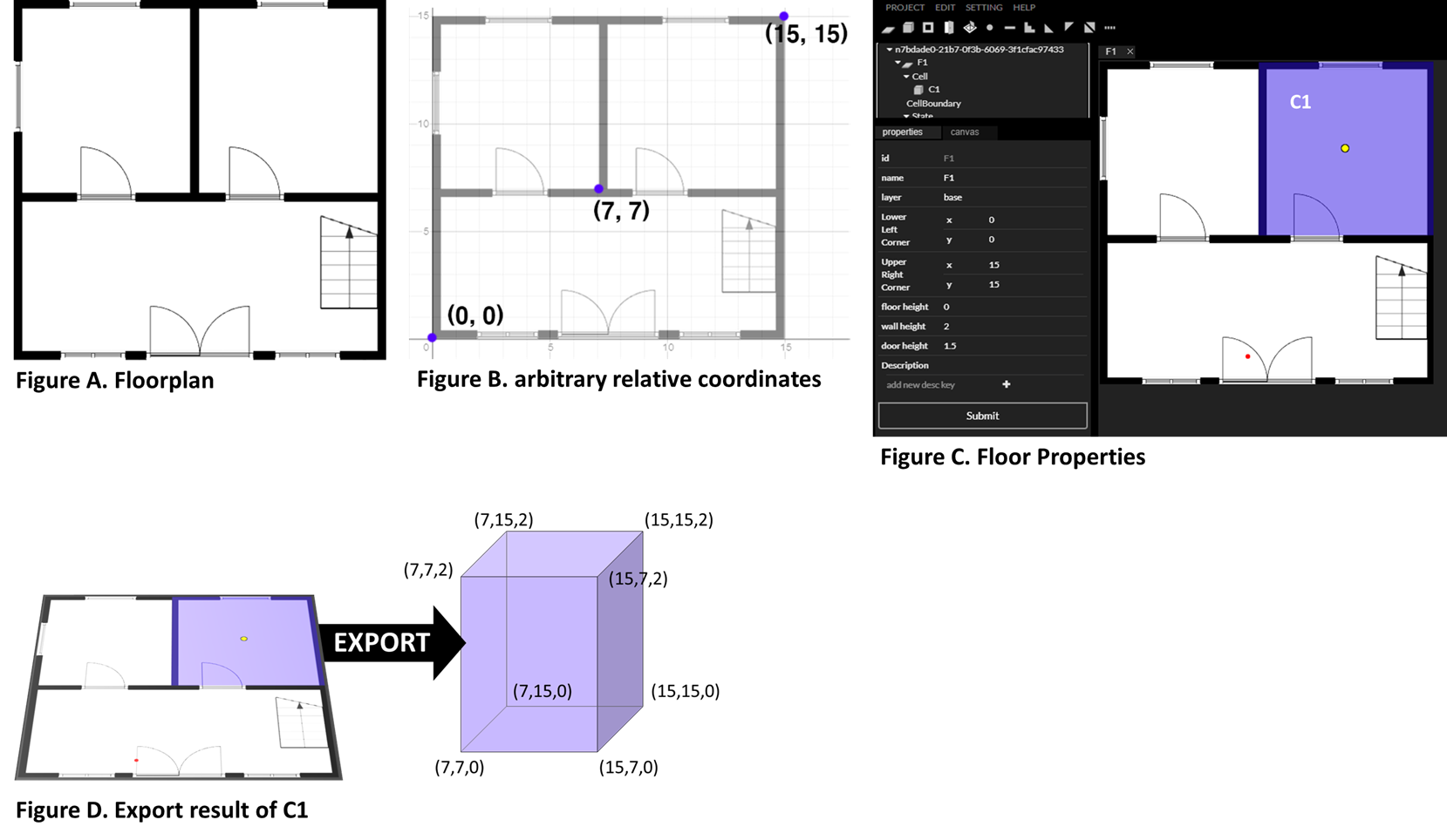 The floor height is the distance from the ground to the floor, and the wall height is the height of the wall of the floor, that is, the distance from the bottom of the floor to the ceiling. To define 3D geometry, InEditor simply extrudes 2D geometry that exists in InEditor. Therefore the z value of the coordinate value output to the IndoorGML file is greater than or equal to floor height, but it is less than or equal to floor height plus the wall height.