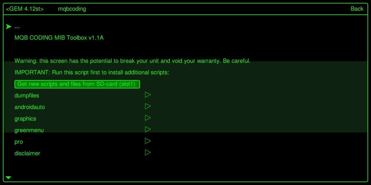 Warning These screens have the potential to break your unit and void your warranty. Be careful. We are not responsible for any troubles to you, your car or software. MQB Coding is always looking for cool hacks and retrofits to increase the potential of the MQB platform. It's never our intention to harm any person, car or brand.