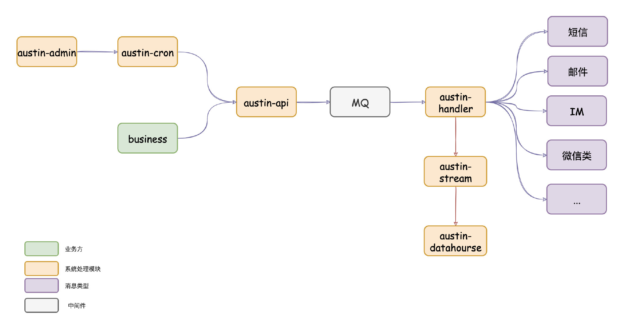 austin项目核心流程:austin-api接收到发送消息请求,直接将请求进MQ。austin-handler消费MQ消息后由各类消息的Handler进行发送处理