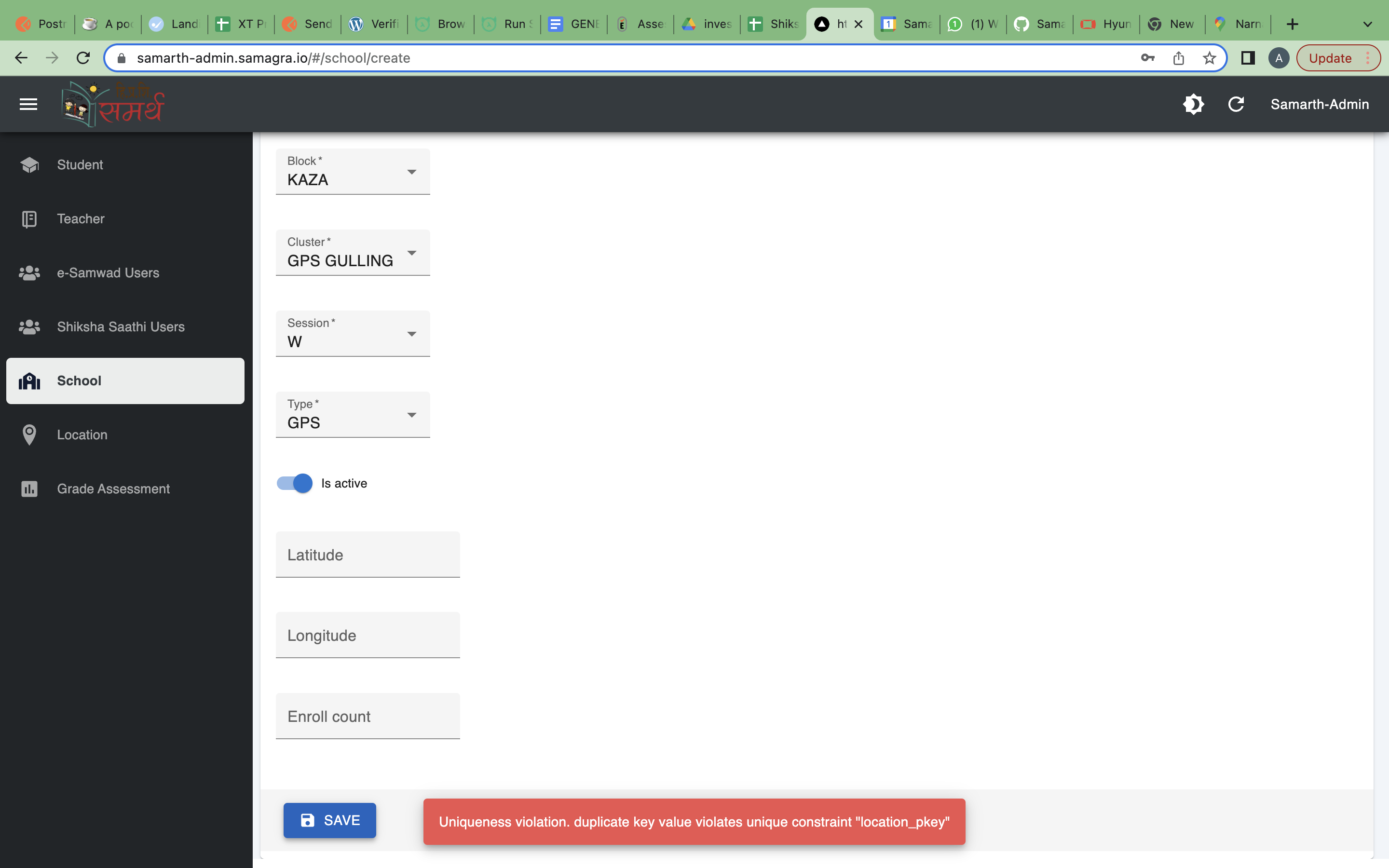 Description: We are facing an issue while creating school on admin console. It show the error captured in the screenshot.