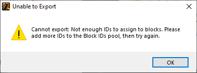 This process will also assign IDs to all unassigned blocks and lock these IDs in place. This ensures that all existing tiles will keep the same ID in future exports, even if tiles are added or deleted from the tileset. If, for whatever reason, you want to re-assign the automatically-generated IDs, you can clear the assigned IDs from File->Clear Auto-Assigned IDs. This will not clear IDs that you manually assigned to individual tiles.