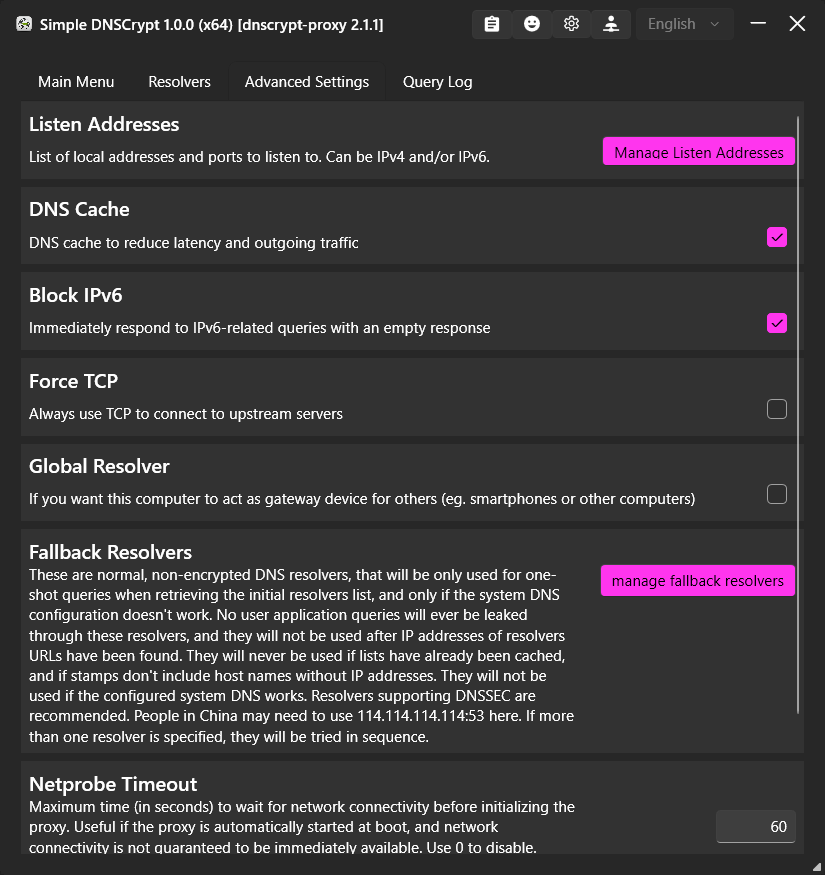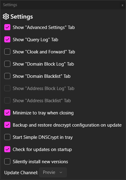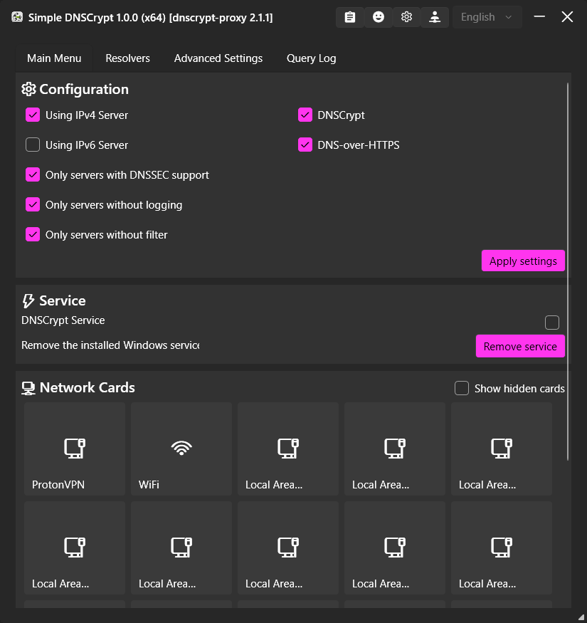 Simple DNSCrypt is a simple management tool to configure dnscrypt-proxy on Windows-based systems. This fork has been updated to use .NET 10, incorporates the new built-in Fluent theme support for a modern UI, and includes the latest versions of all NuGet packages.