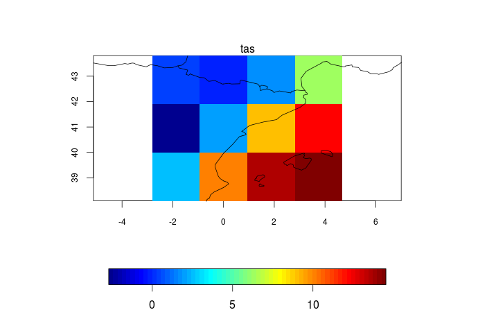plotMeanGrid(multi)sub.geo.multi <- subsetGrid(multi, lonLim = c(-1, 3), latLim = c(39,43))