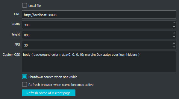 as a URL to make the webpage independant from the server, this helps when you don't want to reload the source every time OBS starts before the server. If the correct checkbox is set, this can be fixed by toggling visiblity of the source, which refreshes the page.