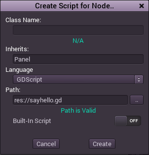 The script creation diallog will popup. This dialog allows to select the language, class name, etc. GDScript does not use class names in script files, so that field is not editable. The script should inherit from "Panel" (as it is meant to extend the node, which is of Panel type, this is automatically filled anyway). Select the filename for the script (if you saved the scene previously, one will be automatically generated as sayhello.gd) and push "Create":