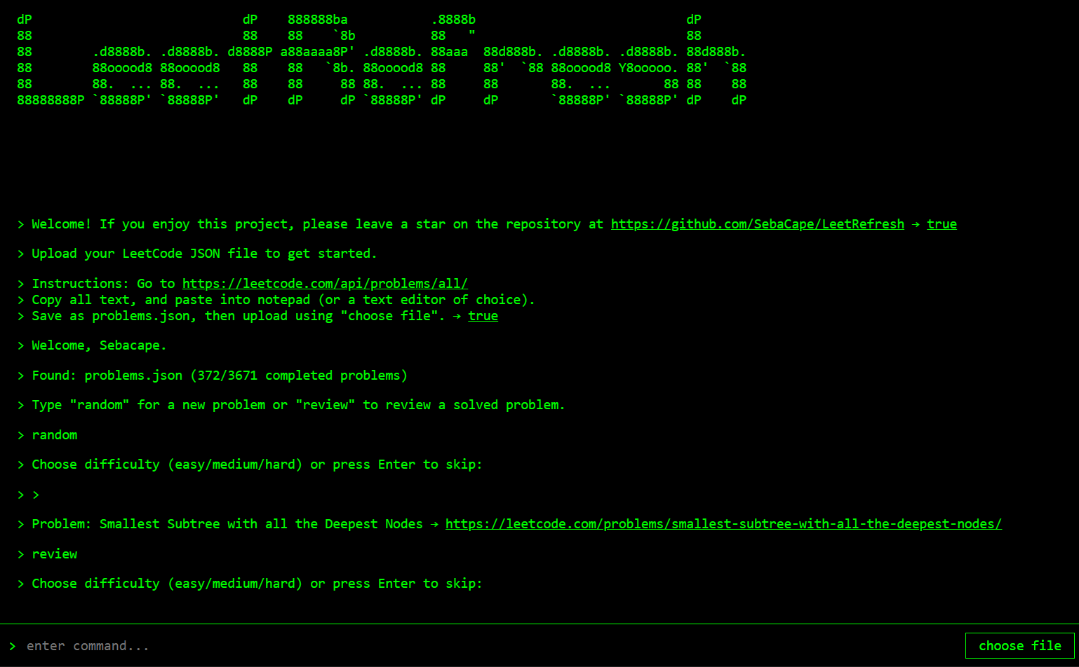 LeetRefresh is a browser-based terminal-style interface for browsing and practicing LeetCode problems. It allows users to load their LeetCode problem data from the API and interactively fetch problems by type and difficulty, all within a retro CLI aesthetic.