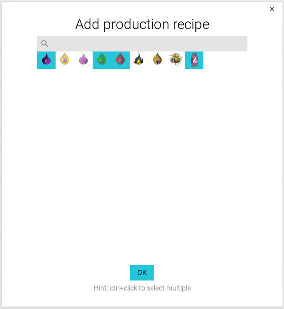 Where logical (The Add production recipe, Add consumption recipe, Select raw recipe, and Add new milestone windows) this allows you to control-click to select multiple items. The currently selected items are highlighted, and you can control-click again to deselect them. After control-clicking at least one item, use the OK button to add all selected items and close the window.