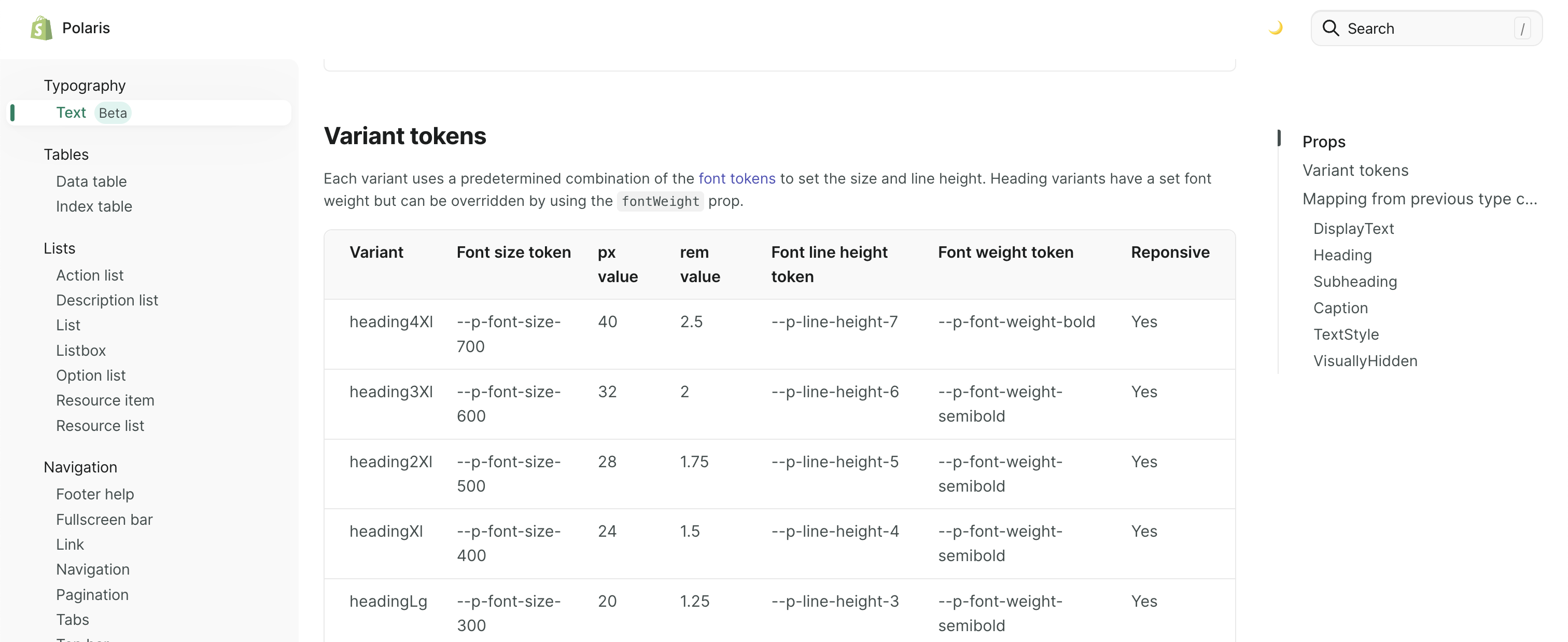 |`headingXs`|`--p-font-size-75`| 12 | 0.75 |`--p-line-height-1`|`--p-font-weight-semibold`| No |