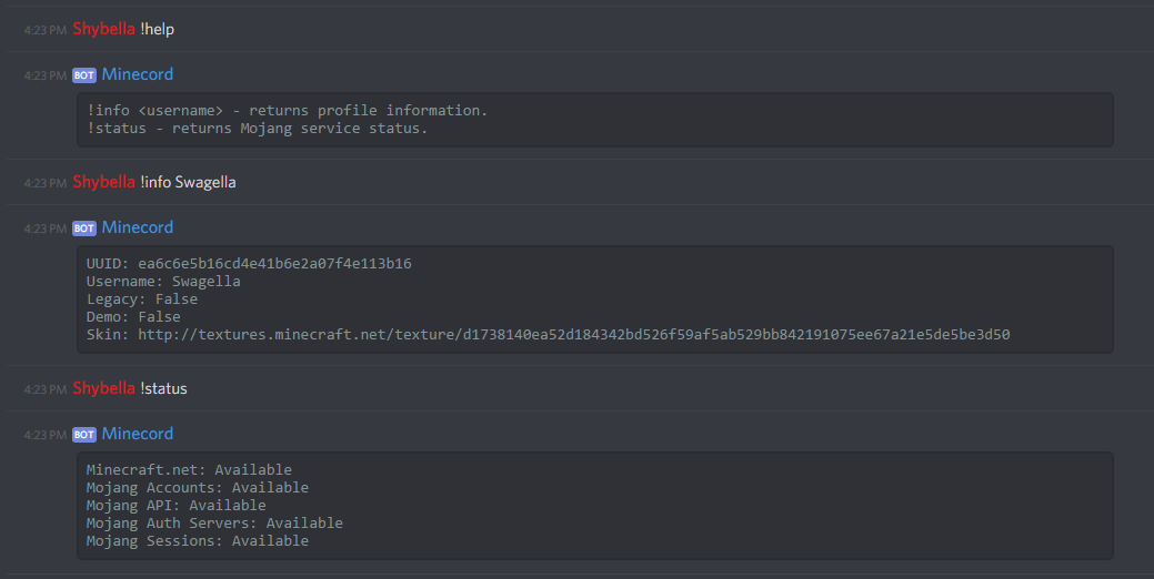 Minecord - Discord Bot Commands: - !help - !info <username> - return minecraft profile information - !status - returns Mojang service status