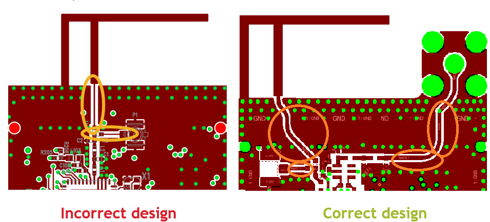 - Use the shortest traces possible to connect the first RX matching network component with the RX input pins of the chip. The RX matching network is very sensitive to any extra parasitic inductance and parasitic capacitance. Doing this way is important to minimize the detuning effects by using as short traces as possible.