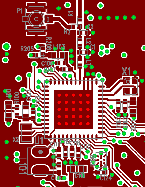 - On the first inner layer, the area beneath the remainder sub-GHz matching network (balun and low-pass filter) should be filled with ground metal. Traces can be routed beneath the area of the balun and low-pass filter sections on all other inner layers.