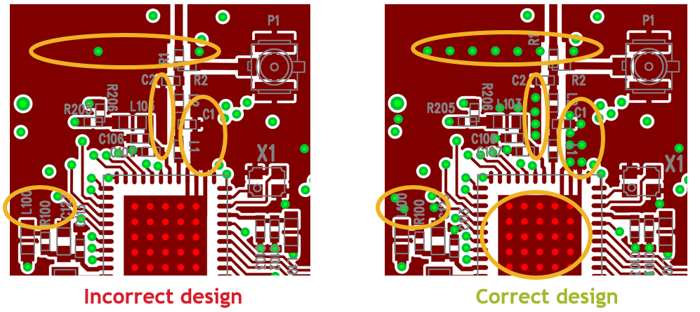 - The exposed pad footprint for the paddle of the EFR32 IC should use as many vias as possible to ensure good grounding and heat sink capability. In the reference designs there are 25 vias for the 7x7 mm sized package ICs, each with 10 mil diameter.