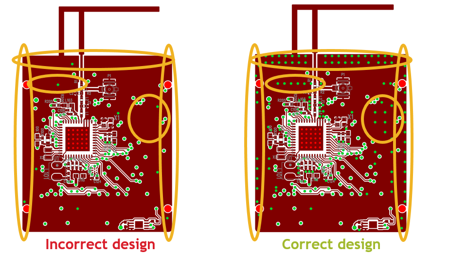 - Use as many grounding vias at the GND metal edges (especially at the edge of the PCB and along the VDD traces) as possible in order to reduce their harmonic radiation caused by the fringing field.