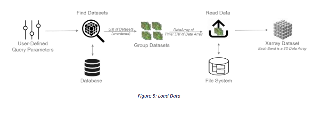 User-supplied query parameters are used as a lookup into the metadata database in order to determine which datasets hold data requested by the user. Those datasets are then grouped and ordered, and the actual data is loaded from the file system. The resulting data is organized into an Xarray Dataset with appropriate temporal-spatial dimensions and separate data variables for each band.