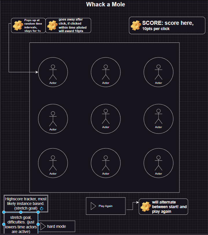 Instructions: Click the moles as fast as you can to score points. You may click the mole as many times as you would like, but if you click when there is no mole you will lose points! 400pts wins the game. Play it here: https://skyescodes.github.io/WhackaMole/