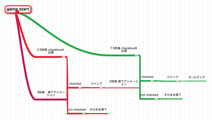 - 例)地面の穴が3秒後、8秒後にそれぞれ現れ、キャラクターが3秒後に落下するようアニメーションを設定している場合を考える。ジャンプボタンが2.5秒後~3秒後の間表示するようアニメーションを指定する。ジャンプボタンを押すことでcheckboxAにチェックが入る(Rule 2)。checkboxAにチェックが入っている時におけるキャラクターのアニメーションを「5秒後に落下する」とすることでアニメーションを上書きし、一つ目の穴では落下せず、二つ目の穴が現れる時に落下するようにする。これを繰り返すことで、タイミングよくボタンを押せばステージの先へ行けるが、押さなければ落下する、というゲームを作ることができる。