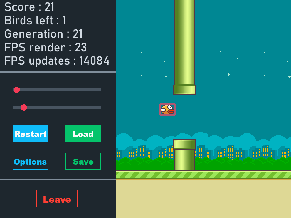 When starting the game, we spawn many different birds, with each a different AI. The AIs are 4 neurons each, where they learn how to play the game using a genetic algorithm (Automatic learning for neural networks) -> The moment every bird has died, each AI's score is collected, we gather the 10% best and mutate their neuron weights, then spawn the same amount in the next phase. -> Score is calculated based on the amount of time survived, and how close the bird was to the gap right before dying.