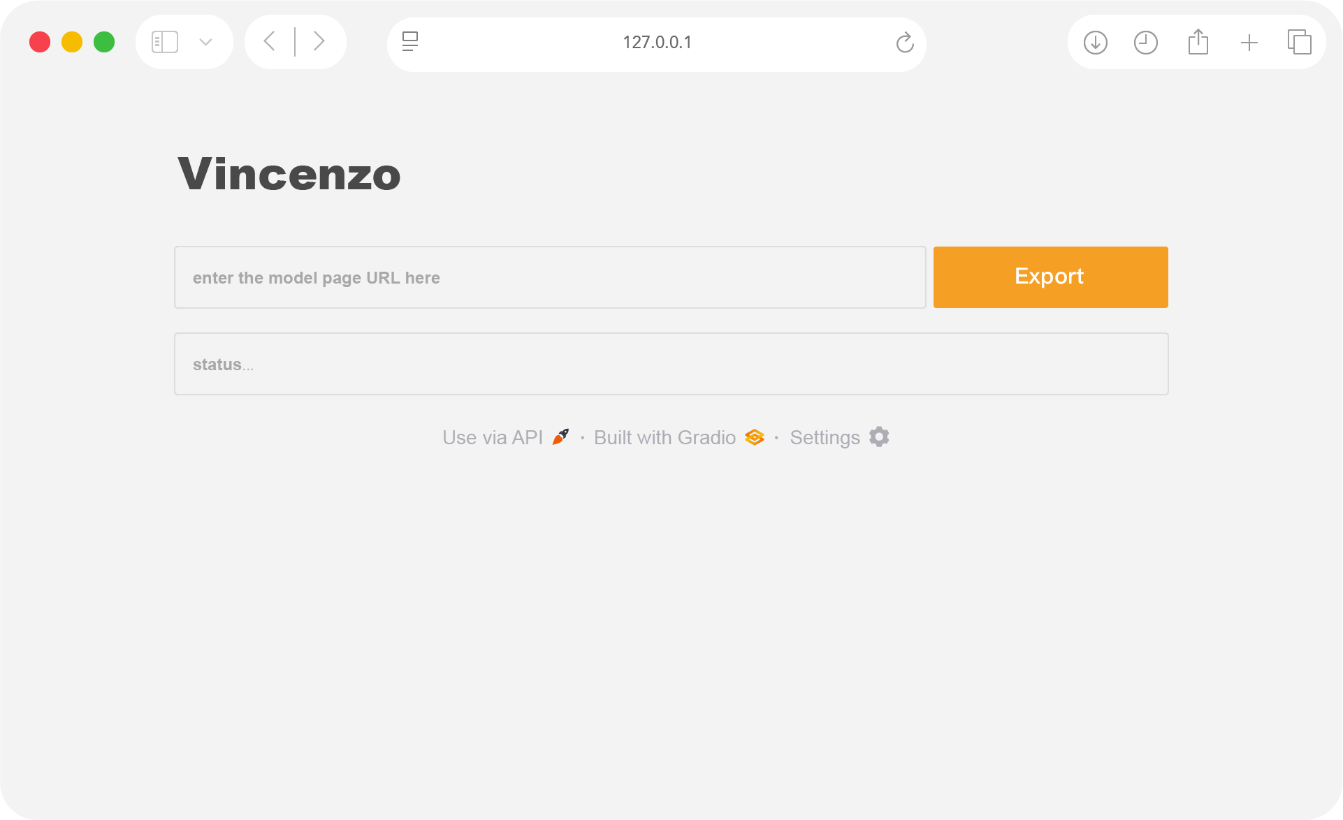 conda activate vincenzopip install -r requirements.txtpython vincenzo.py "<civitai model page url>" # Keep the quotation marks around the URLpython vincenzo.pyThis launches the interactive web interface (default: http://127.0.0.1:7860/).