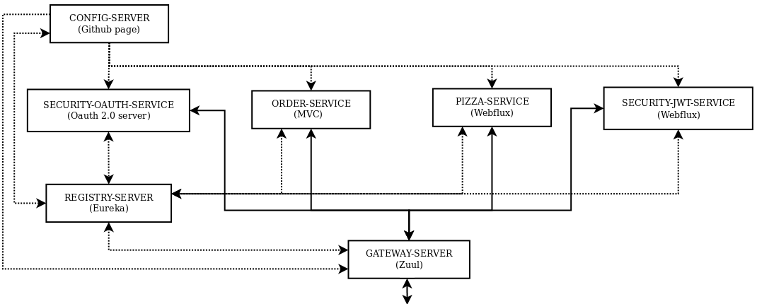 As you read previously, there are two different microservices you can use to manage the authentication/authorization functionality: security-oauth-service and security-jwt-service, in this proof of concept I have used the first one in order-service and the second one to securize pizza-service.